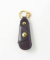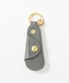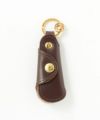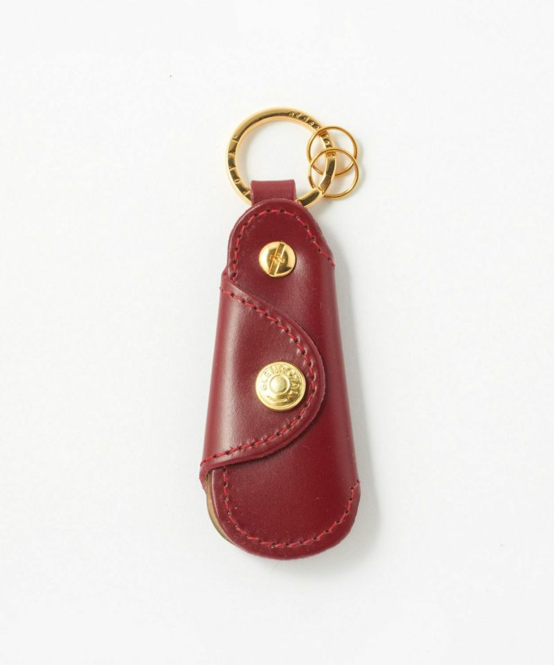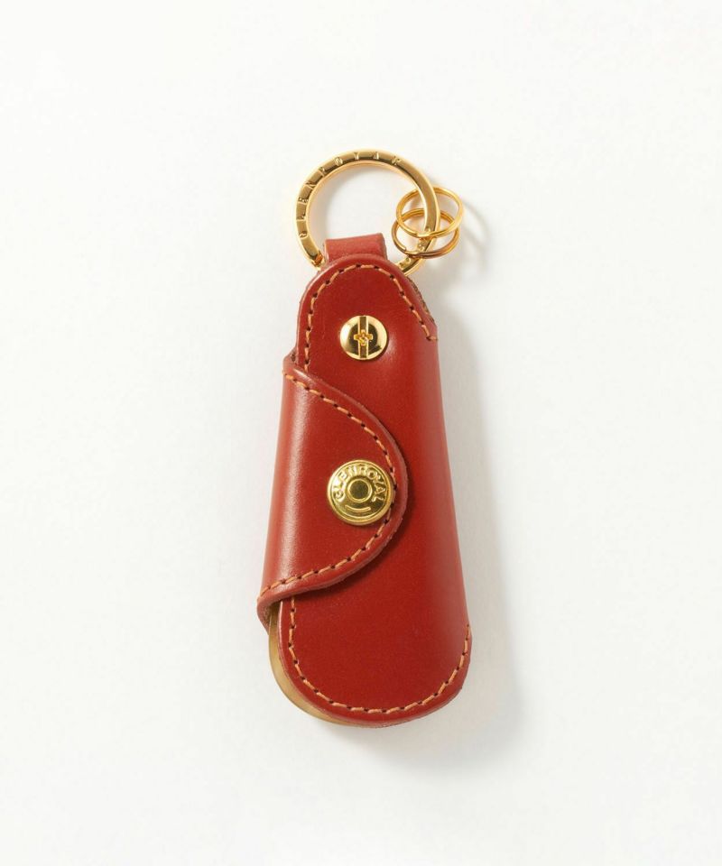 ・ブランド名が刻印されたゴールドのリング。この部分をパンツのベルトループにかけて持ち歩くことも可能。さらにその先にはキーリングを2つ配備することで機能性を高めています。(右下)