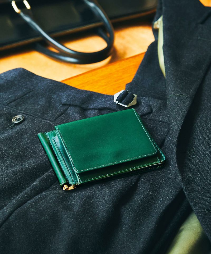 約1.5cmという薄マチなサイズ感の一方、計7箇所のカードポケットやコインケースを付属するなど、実用性を追求しています。「ブライドルレザーの経年変化を味わいたいけど、コンパクトな財布も欲しい」。そんな方にはまさに打ってつけ。オン·オフともに欠かせない収納力を持つ、究極の機能美を実現させたモデルといえます。