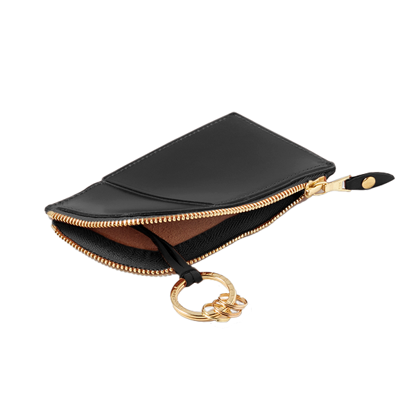 ケースの内側にキーリングが3つ付いており、中に鍵を取り付けて収納することができます。鍵が少ないときは小銭入れとしても使用可能。マチのないすっきりとしたデザインのため、ポケットやバッグの中でかさばらないのも魅力です。外側のカードポケットに電子マネーや定期カードを入れておくと、お散歩など、バッグを持たない外出シーンでも活躍。
