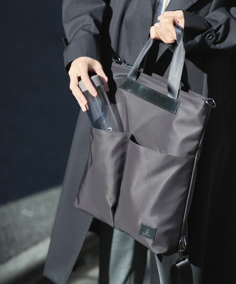 取り外しが容易なショルダーストラップが備わっており、自転車での移動など両手をフリーにしたい際には肩掛けやリュックも可能です。フロントポケットには、ペットボトルなどをすぐに取り出すことができるポケットを設計。荷物をたくさん収納した際にも美しく見えるよう計算されているのも特長。品の良さを大切にしながらも、機能性を損なわないようにしているのがグレンロイヤルのこだわり。素材は程よい光沢があるナイロンツイル(撥水加工)を用い、随所にブライドルレザーをあしらうことで品の良さを演出。