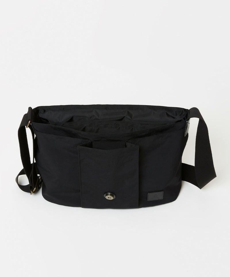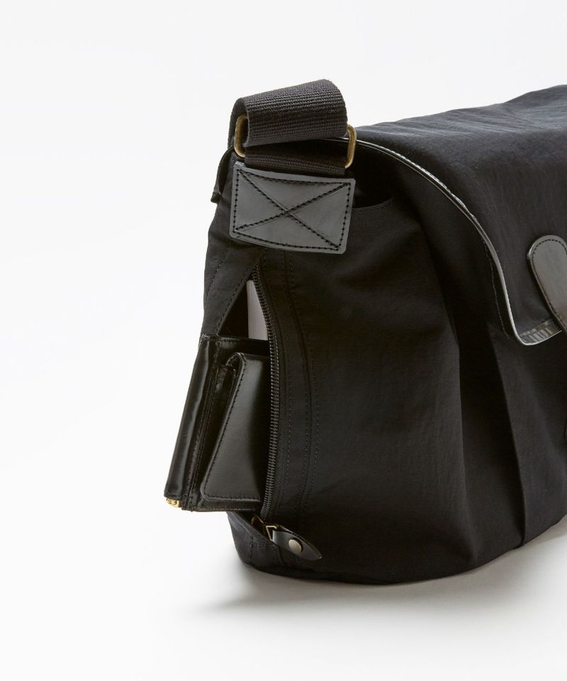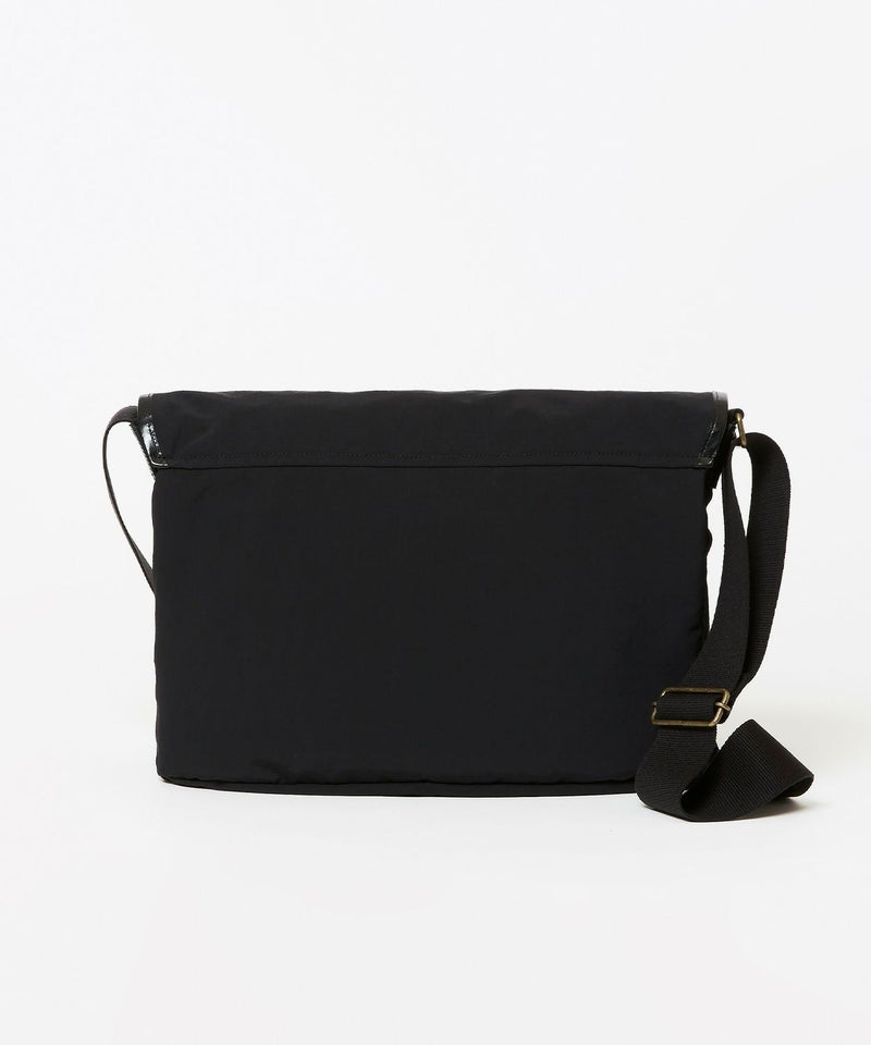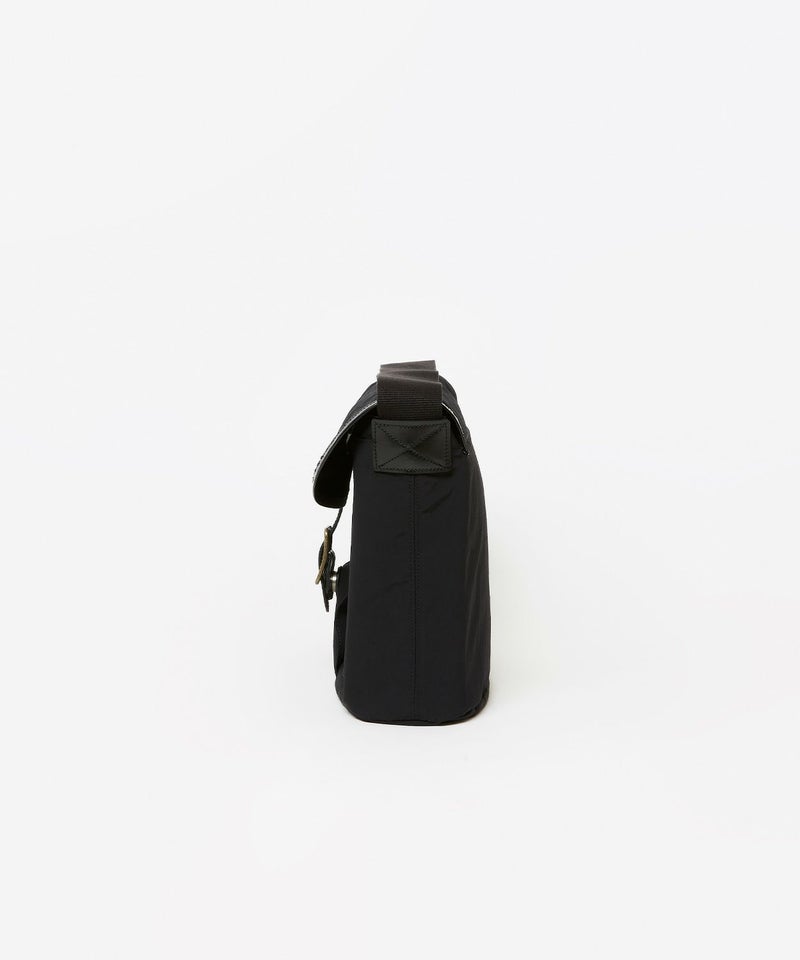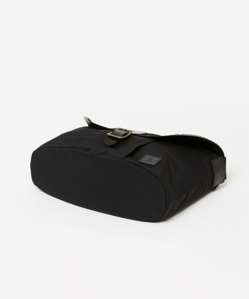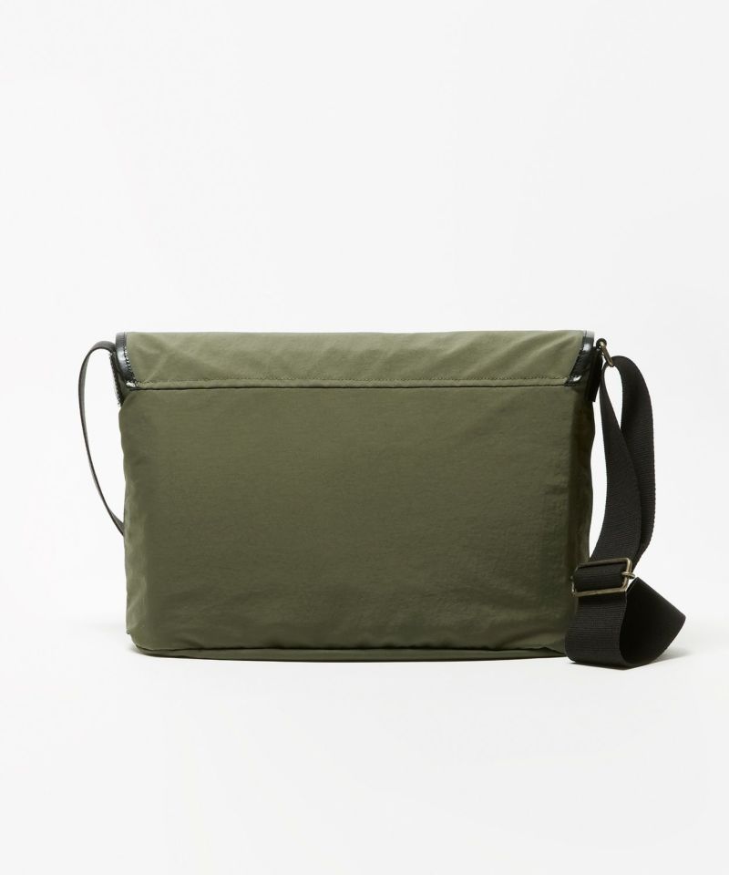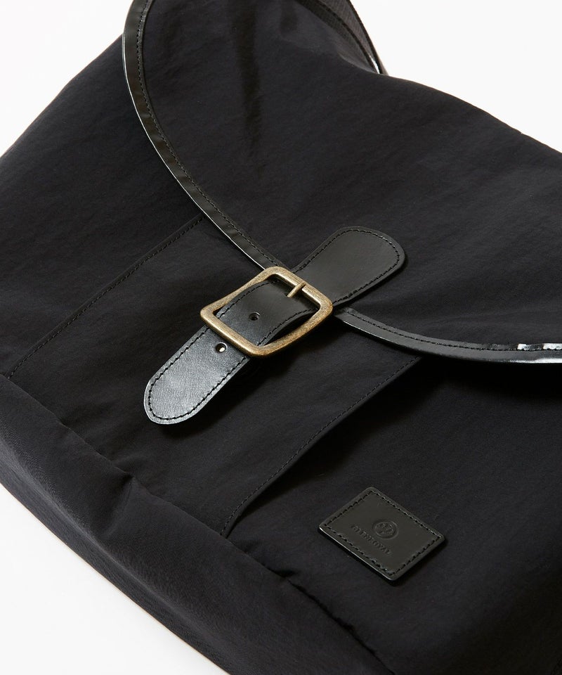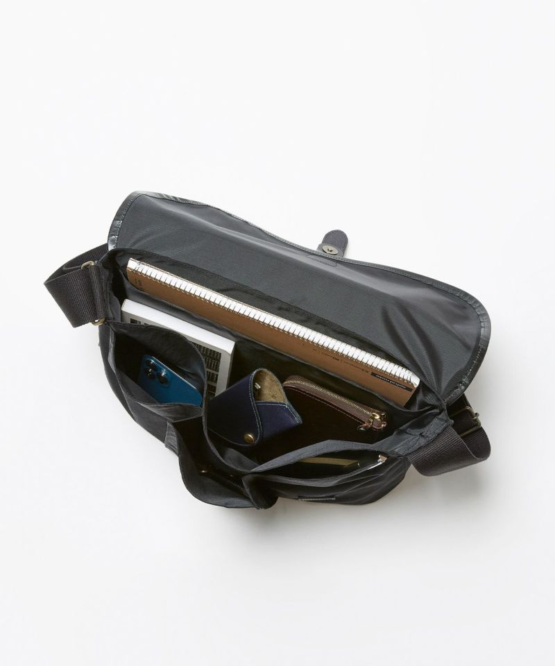 自転車移動などに便利なフラップ付きショルダーバッグは13inch程度のラップトップが入る大きさで、ブライドルレザーをフラップパイピングに贅沢に使用した高級感のある逸品。フラップを開けずに中身が取り出せるファスナー口や、肩が痛くなりにくいように太めのショルダーテープを採用するなど、機能的な面もプラスいたしました。ポケットも充実しておりフロントポケット3、中にPCが収納できるポケットを配置。ナイロン生地にはアクリルをベースとしたバッグコーティング剤(広塗布用)を塗布し、優れたハリ感と撥水機能を持たせました。ブライドルレザーと撥水ナイロンを組み合わせシーズン問わずお使いいただけるアイテムです。