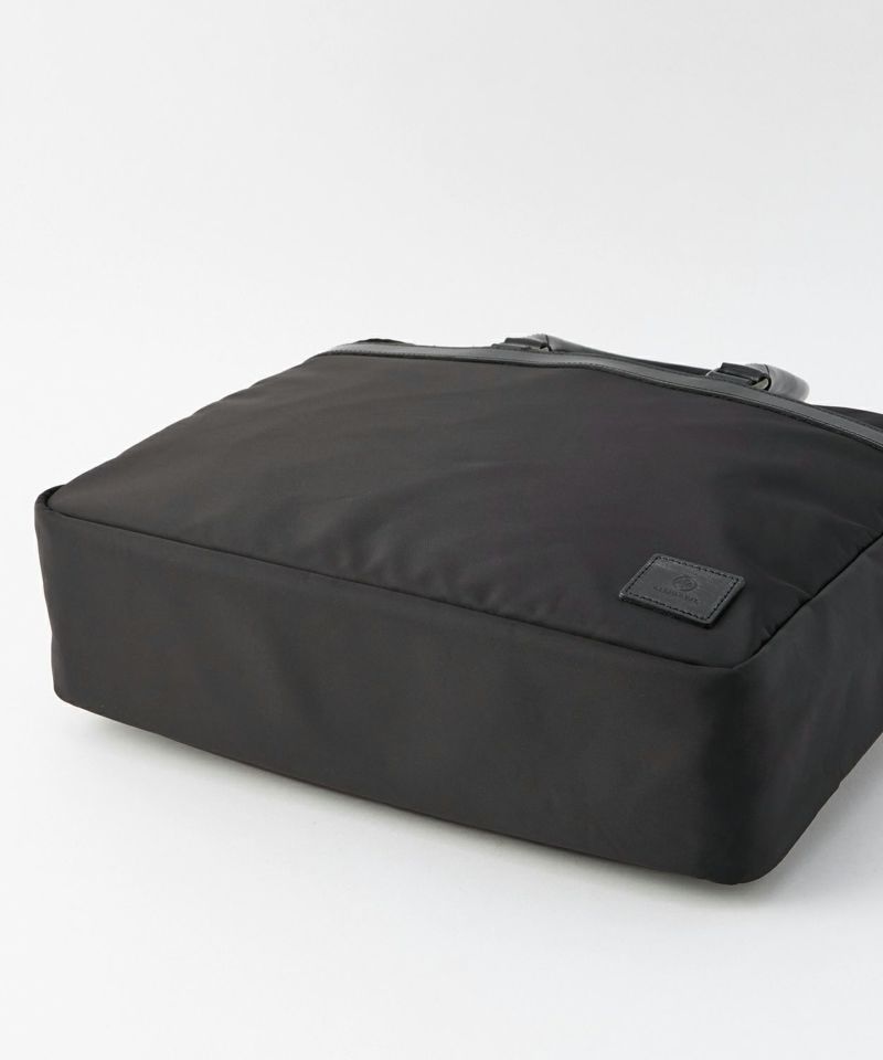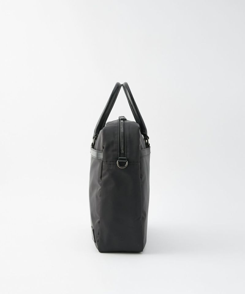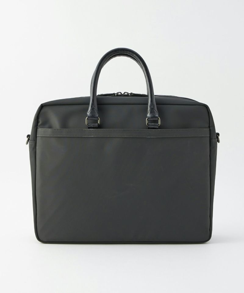 持ち物が多い時にも扱いやすいサイズ感。取り外し可能なショルダーストラップ付きで、2WAYで使用可能です。メインポケットの全面に保護パッドが入っているため、パソコンなども安心して持ち運べます。素材は程よい光沢があるナイロンツイル(撥水加工)を用い、ポケット口部分などにブライドルレザーをあしらうことで品の良さを演出。シンプルながらも高級感のあるアイテムです。