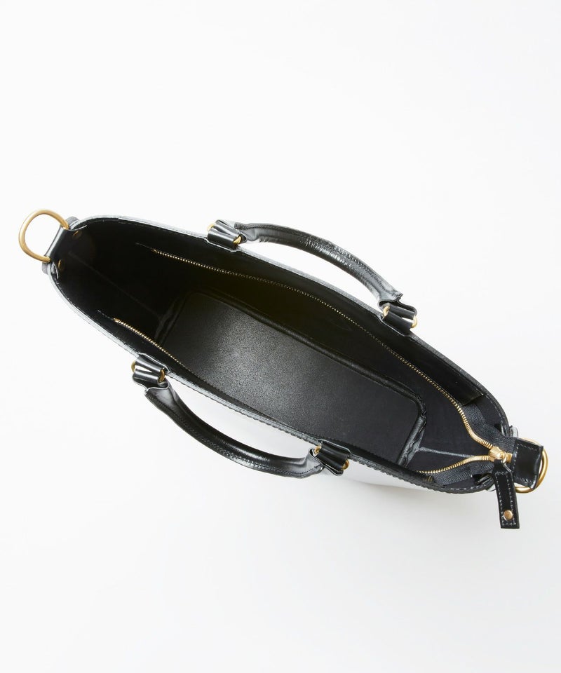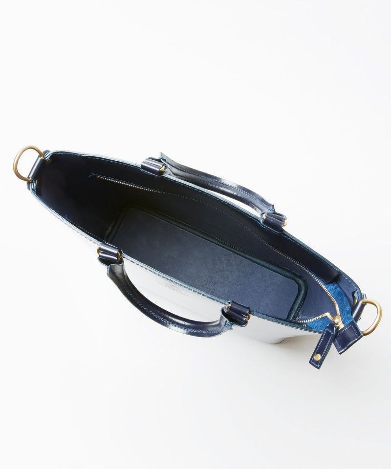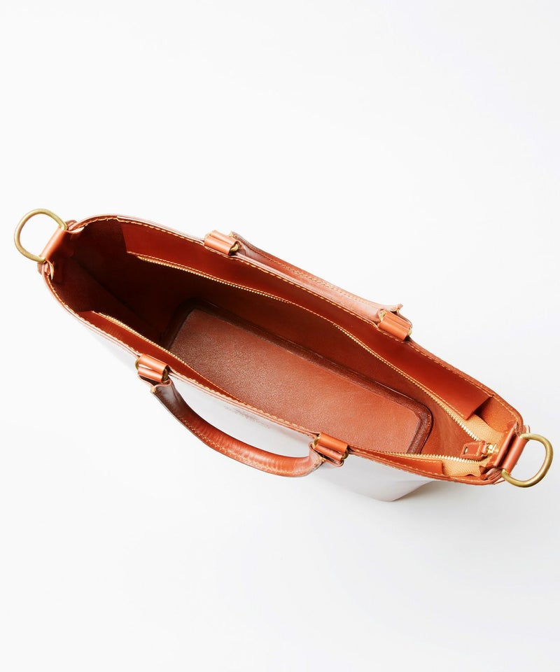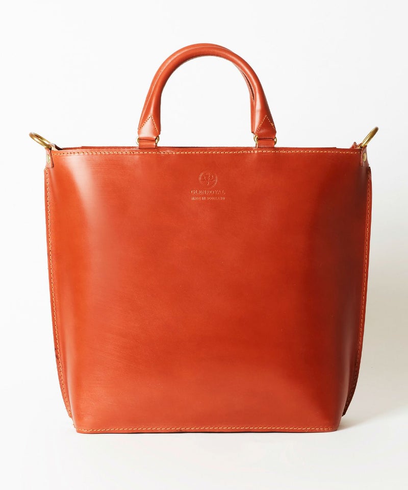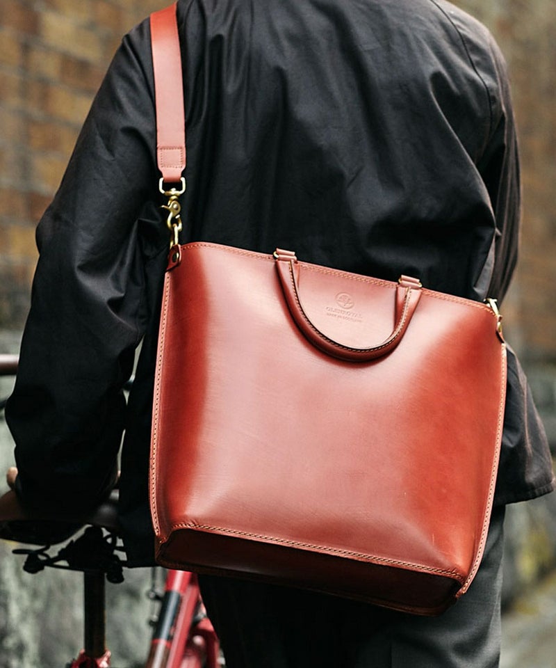 グレンロイヤルのアイコンでもあるブライドルレザーをたっぷりと使い、高級感のある見た目ながら軽量でオンオフ問わず日常的に使いやすいデザイン。パッド付きの取り外しが容易なショルダーストラップが備わっており、自転車での移動など両手をフリーにしたい際には肩掛けも可能です。金具類には味のあるABBEY ENGLAND(アビー イングランド)のアンティークブラスを使用。パッと置いた際に自立できるマチの確保や、トップに中身が飛び出さないようにジップ付きの弁を配置するなど、見た目はシンプルながら細部にまでこだわりが詰まったアイテムに仕上がっています。