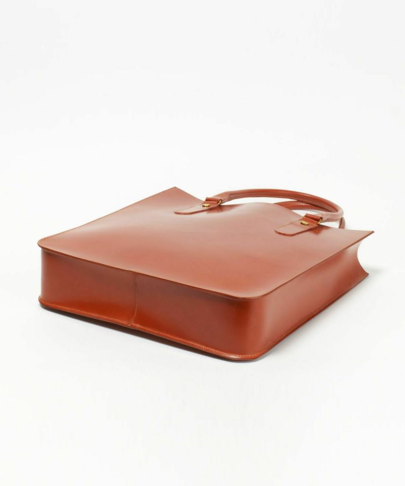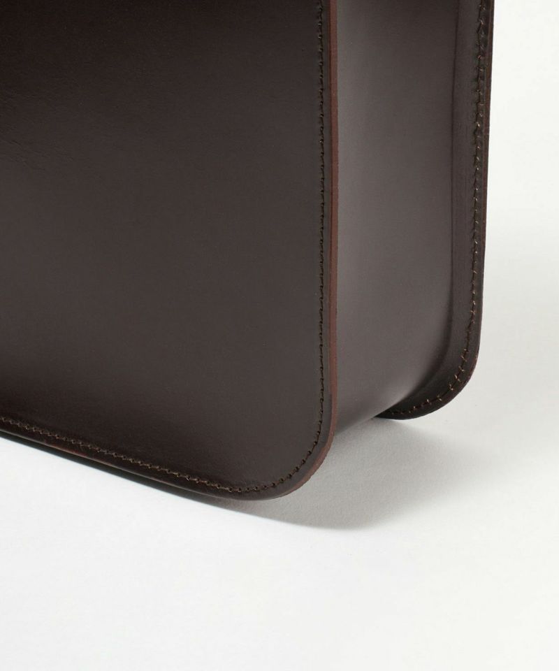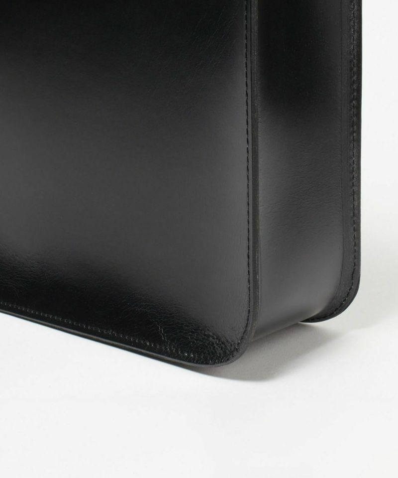 バッグのマチ(厚み)は約8cm。パッと置いた際に自立するので、訪問先で足元に置いても安心な仕様。ハンドルとボディーを繋ぐのは、馬具で使用される英国製のアンティークブラスのパーツ。堅牢さに優れ、同じ馬具由来のブライドルレザーとの相性も抜群です。バッグそのものがシンプルな作りになっているため、ビジネスシーンにはもちろん、休日などオンオフ問わずお使いいただけます。