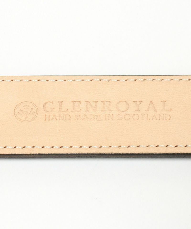 ナチュラルレザーを張り合わせることで上品な仕上がりに。強度を高めるだけでなく、ベルトループにスムーズに通せるように滑りを良くする役割も。グレンロイヤルの刻印も男心をくすぐります。