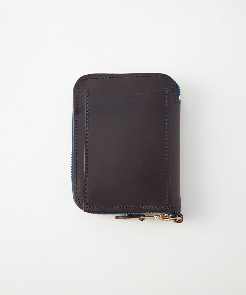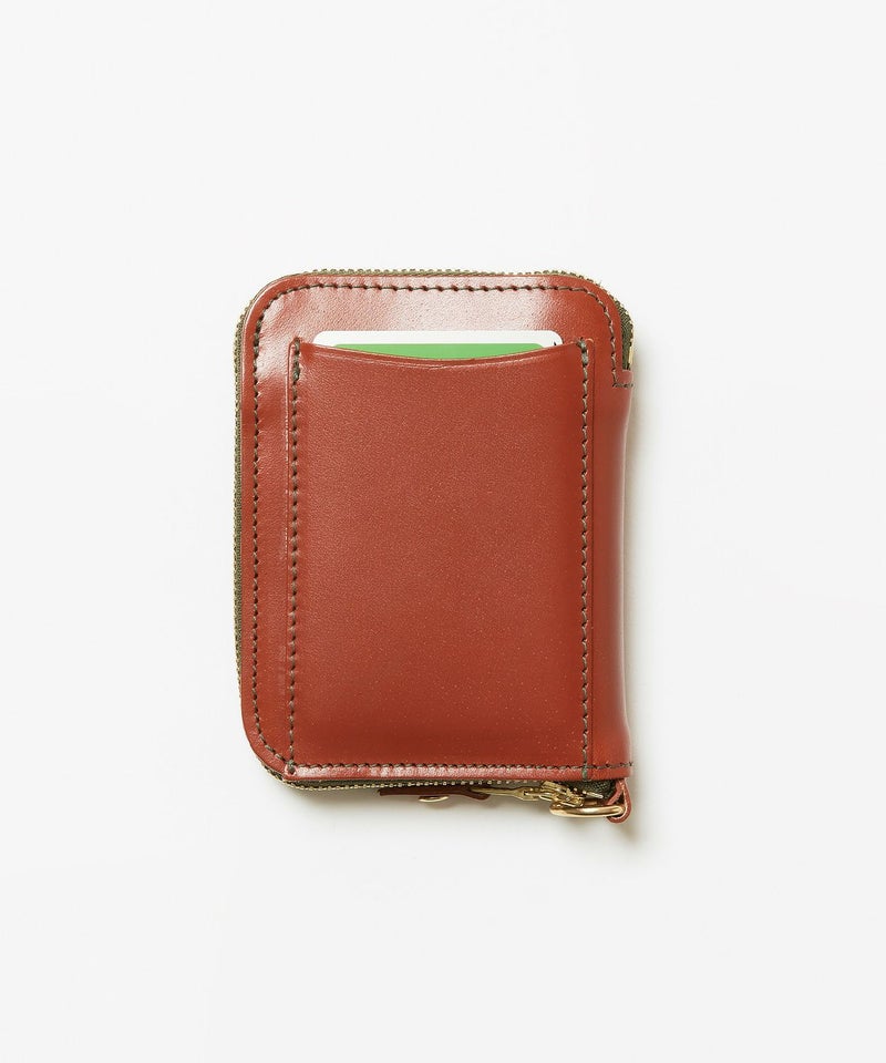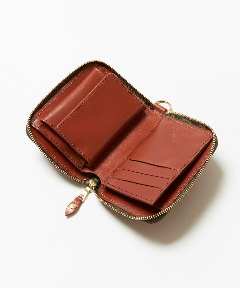 クレジットカードほどのサイズ感で、財布を開くと内側にはカード収納やマチ付きのコインケース、さらには仕切り付きの札入れがあるため、見た目以上に充実した収納力を備えています。背面外側にもカードポケットがあることで使用頻度が高いICカードなどを収納でき、財布を開かなくてもカードの出し入れが可能です。ウォレットコードやタッセル、キーホルダーなどを付けることができるDリングを搭載しているので、独自のアレンジもお勧めです。