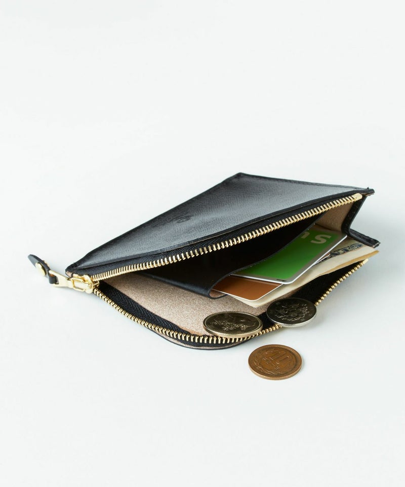 サイドに取られたマチが大きく開き、コインの出し入れもスムーズに。中に仕切りがついているため、カード類や二つ折りにしたお札などの仕分けも可能です。コンパクトなサイズ感のため、クラッチバッグやハンドバッグはもちろん、休日のお出かけにはデニムの後ろポケットにも収めていただけます。 ユニセックスなデザインで男女問わずご使用可能。プレゼントとしても喜ばれるアイテムです。