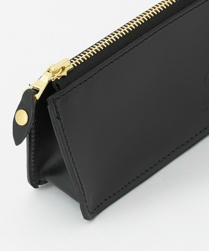バッグの中でかさばらない丁度良い大きさで、開閉しやすいジップが付き、何よりポンと置いた際にしっかり自立してくれる使い勝手の良さが考えられた仕様。ブライドルレザーの滑らかで気持ちの良い質感も気分を高めてくれます。