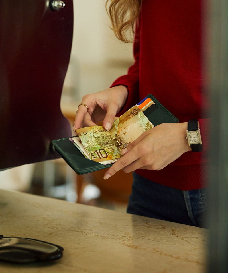 しっかりしたホールド力のクリップに、4つのカード室。クレジットやデビットカードなど、会計時に多用するカードを入れるならこのスリットがお薦めです。また、中面向かって左側の隅に、三角形のスリーブが縫い付けられており、お札を整えて挟むことができます。