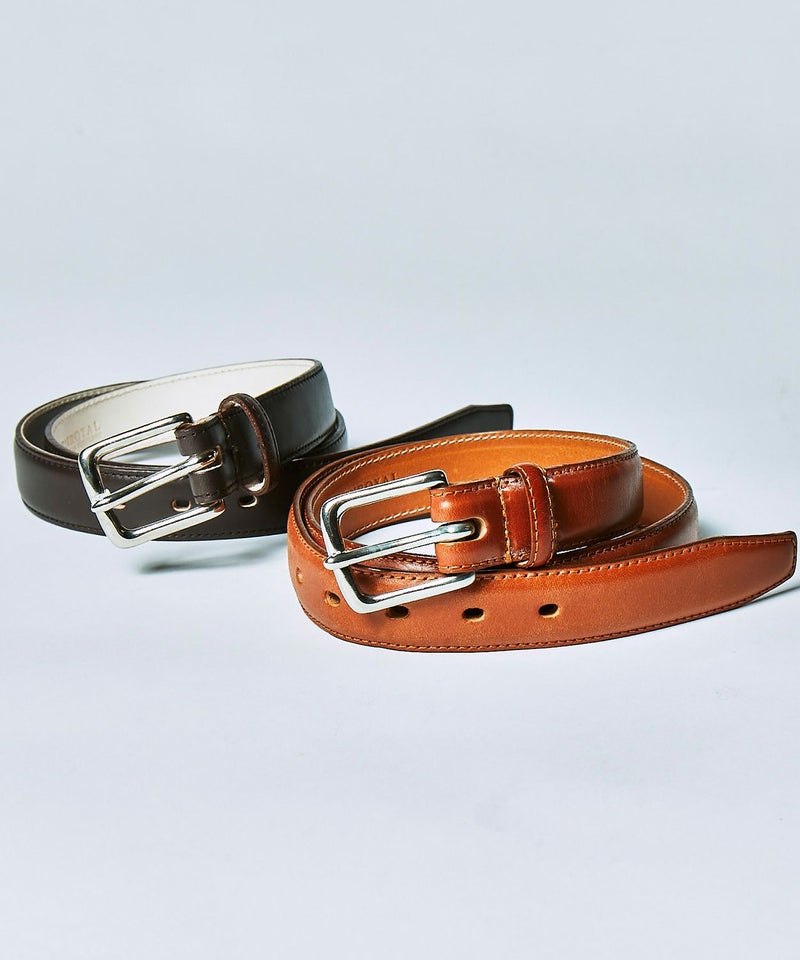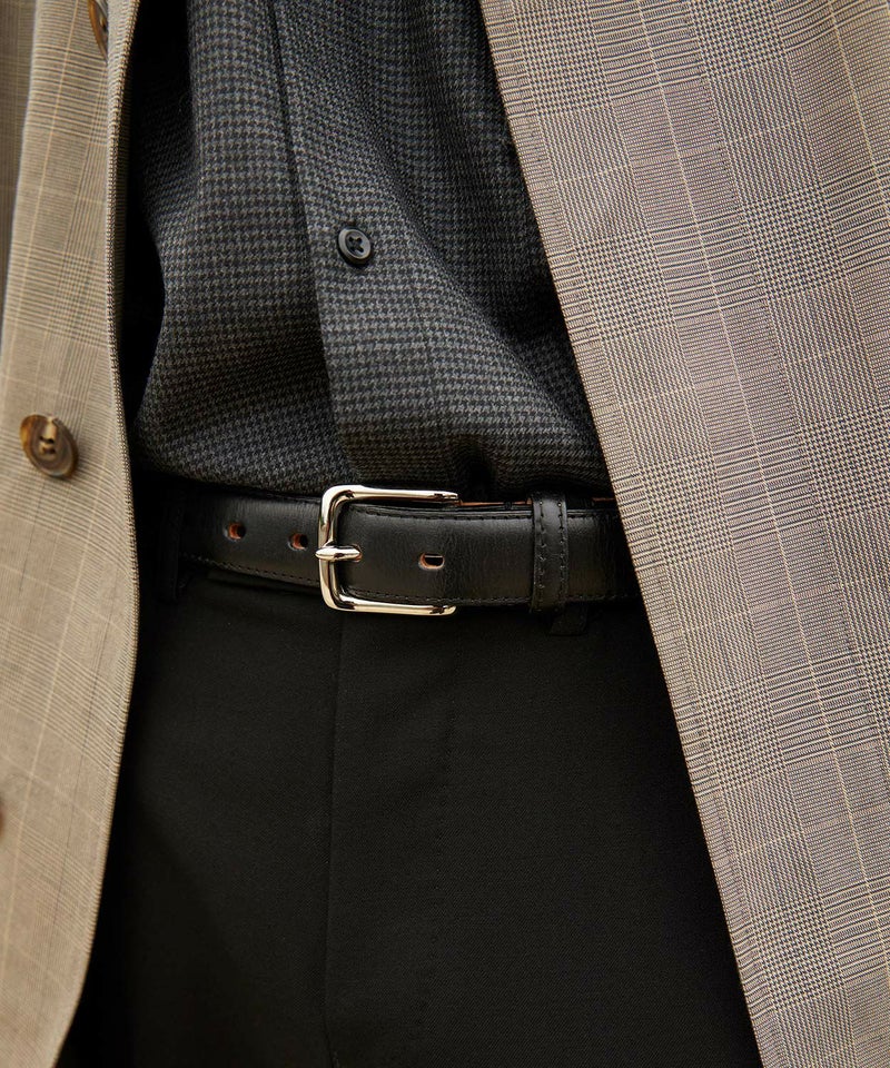 余計な装飾がないルックスに加え、2.9cmと太すぎず・細すぎず絶妙なベルト幅。さらに、バックルにブラスやゴールドではなくシルバーカラーを選ぶことで、ドレススタイルへの相性を高めました。ドレスパンツのウエスト部にちょうどよく収まり、ビジネスの装いに程よい落ち着きをもたらします。