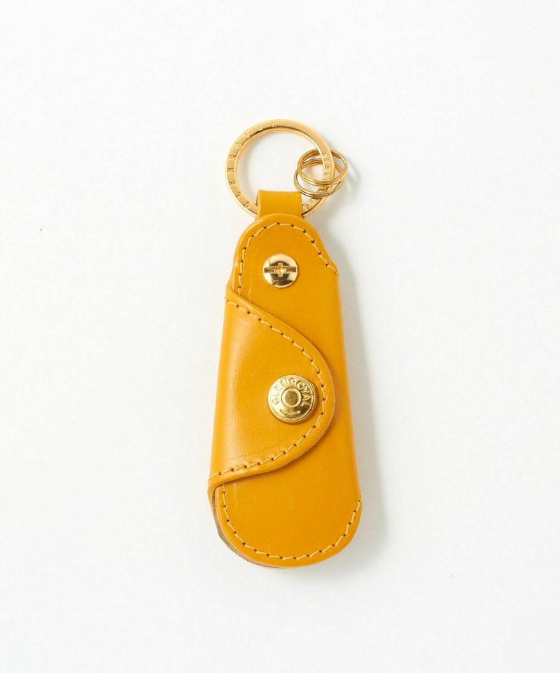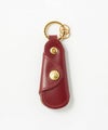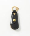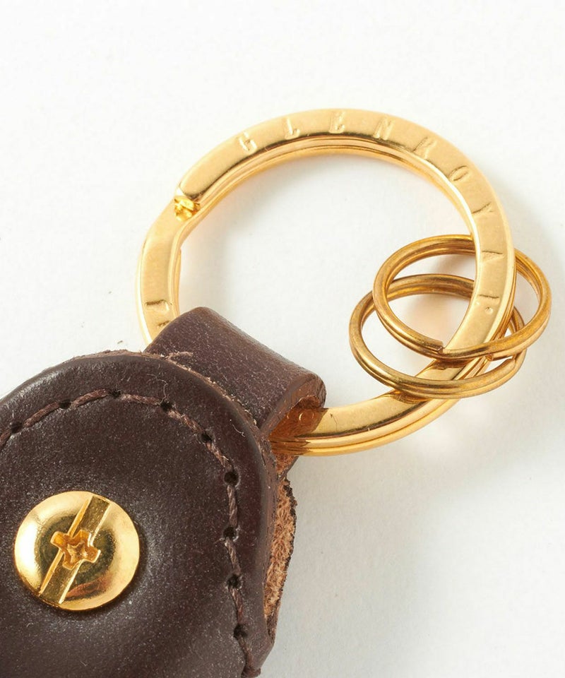 ・ブランド名が刻印されたゴールドのリング。この部分をパンツのベルトループにかけて持ち歩くことも可能。さらにその先にはキーリングを2つ配備することで機能性を高めています。(右下)