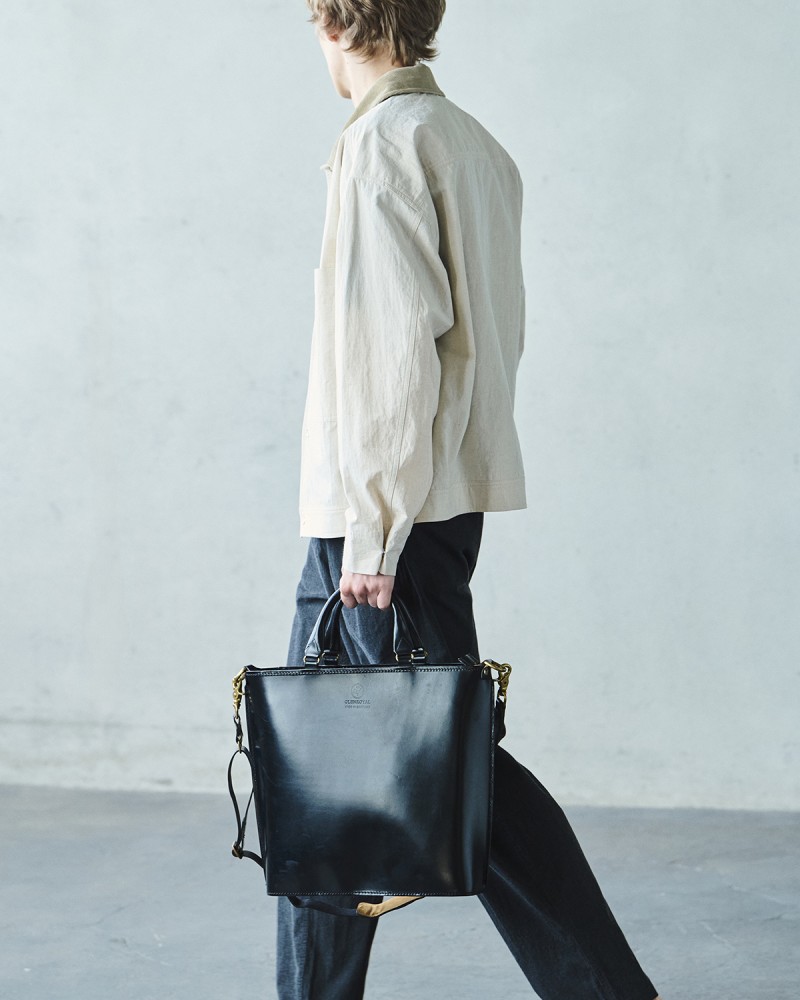 A4書類もゆったり収納できる縦長トートバッグは、ビジネスシーンでもカジュアルシーンでも頼れる相棒です。自立する設計なので、訪問先でもバッグを足元に置きやすく、すぐに取り出せる安心感があります。さらに開口部はジップ仕様になっているため、中身を見られる心配もなく、防犯面でも安心です。ハンドルと本体を繋ぐのは、馬具で使用される英国製アンティークブラス。堅牢で美しい素材感が、同じく馬具由来のブライドルレザーと絶妙にマッチし、使い込むほどに味わい深く変化していくのも魅力のひとつです。オンオフ問わず活躍するこのバッグは、機能性と上質感を兼ね備え、日常のあらゆるシーンをワンランク格上げしてくれます。